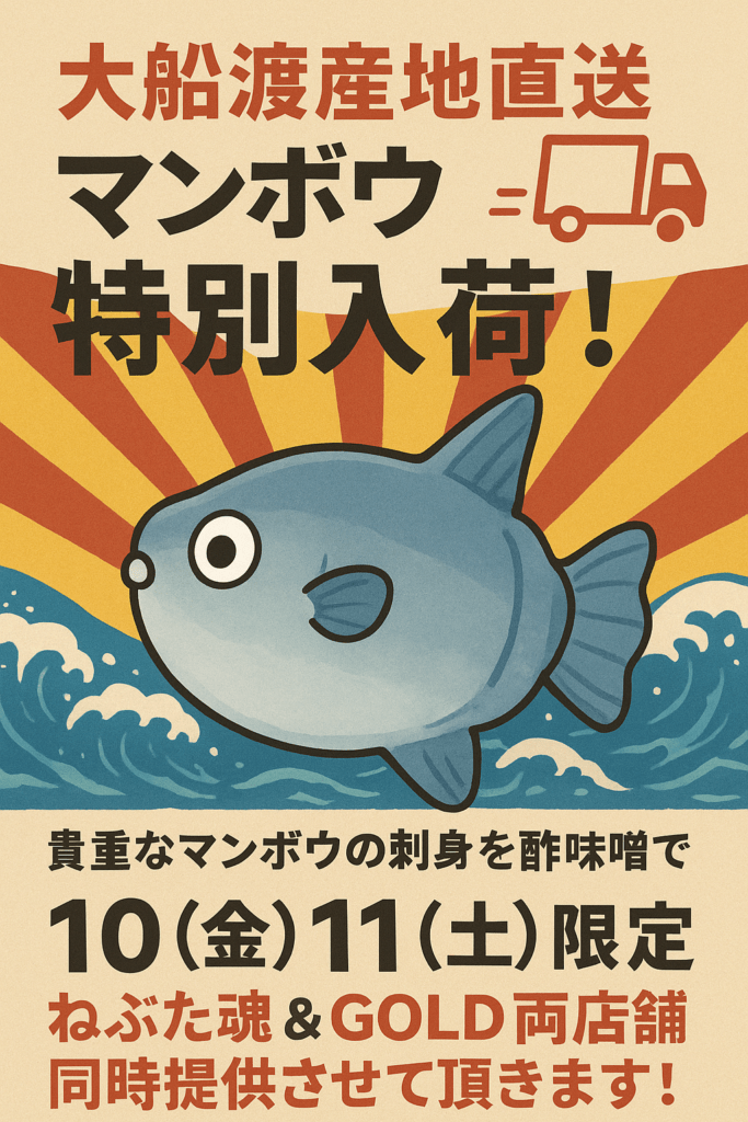マンボウ!!入荷! 2025年10月9日 大船渡🌊産地直送🚚 マンボウ🤯特別入荷! 貴重な✨️ マンボウ の刺身を酢味噌で🐟️ 10(金)11(土)限定 ねぶた魂🔥 & GOLD✨️ 両店舗!!同時提供させて頂きます! 大船渡 #サンマ #マンボウ #居酒屋 #ねぶた魂 #国分町 #田酒 #プロレス #GOLD #刺身